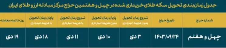 متقاضیان جهت دریافت سکه، به جدول زمانی تحویل سکه توجه داشته باشند. زمان تحویل بدون هزینه انبارداری سکه طلا، در بازه زمانی ۳ الی ۱۰ دیماه است؛ طی این دوره فقط هزینه تحویل از سوی شعب بانک عامل دریافت میشود. هزینه تحویل ۳۰ هزار تومان به ازای هر سکه برای کل دوره خواهد بود.