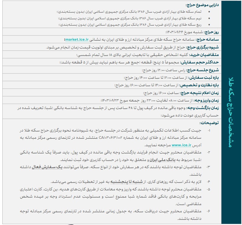کلیه اشخاص حقیقی با تابعیت ایرانی بالای ۱۸ سال تمام شمسی میتوانند در این حراج شرکت کنند و حداکثر حجم سفارش و خرید برای هر متقاضی مجموعا ۵ قطعه سکه است. به نحوی که میتوان ۵ قطعه ربع سکه یا ۵ قطعه نیم سکه یا ۵ قطعه تمام سکه، و یا ترکیبی از هر سه شامل تمام سکه، نیم سکه و ربع سکه باشد که جمع هر سه باهم نباید بیش از ۵ قطعه باشد.